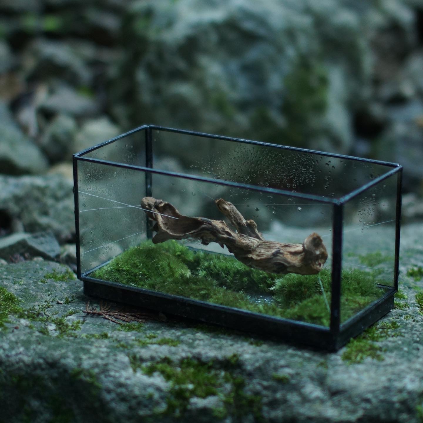 底面は「溜まり池」をモチーフにミラーを使用した水盤です。 ミラー部分に水を溜めると風情のある趣きへと変化いたします。 苔が水を吸い上げる間をお楽しみください。 残った水は排水ください。 育成環境:自然光(LED照明でも可)/霧吹き(もしくは水差し) size:約W200×D100×H100